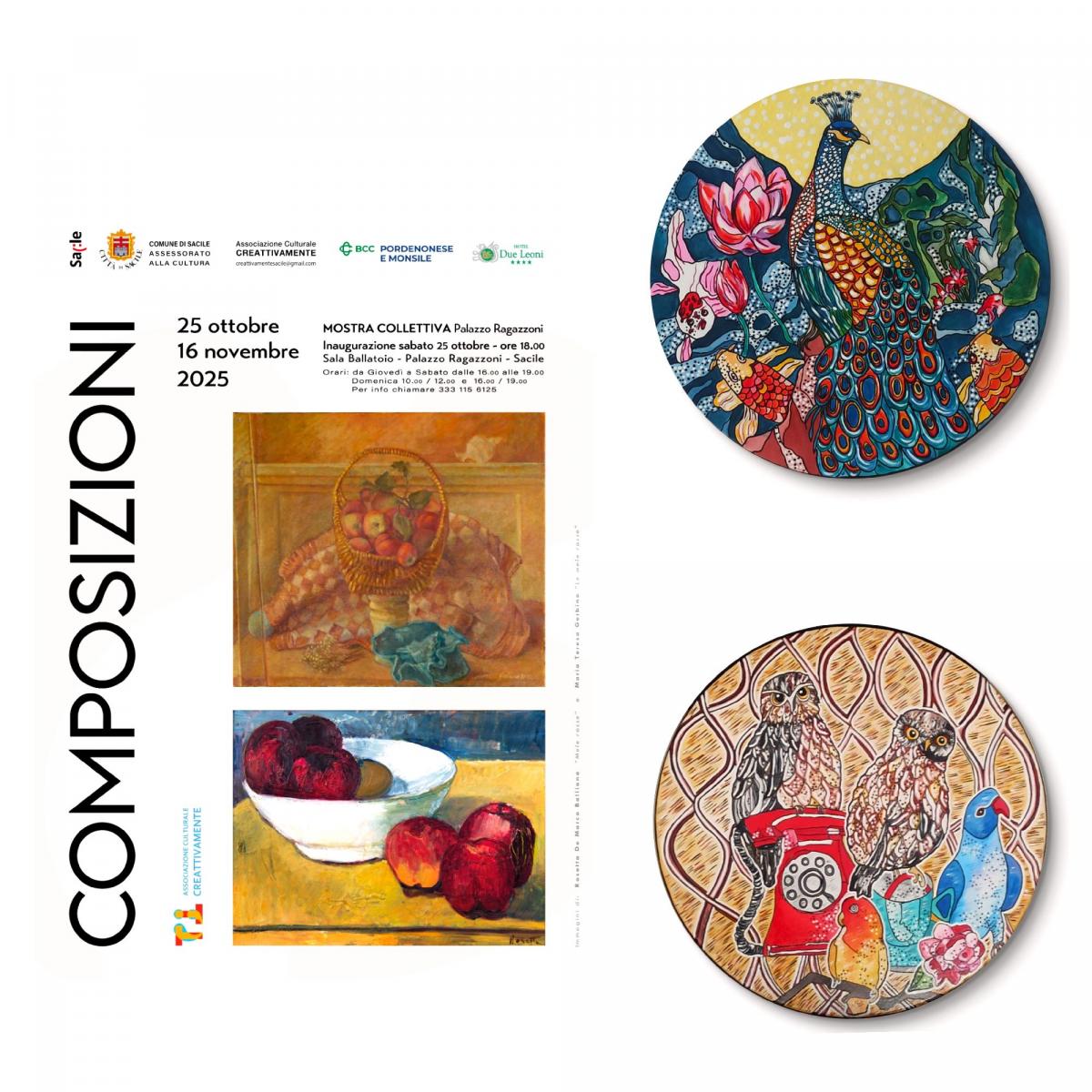 Mostra Collettiva con la partecipazione di sessanta artisti a Palazzo Ragazzoni Sala Ballatoio,Sacile.Il tema " Composizioni" è fondamentala nella storia dell' arte che per alcuni grandi maestri come Giorgio Morandi è diventato il terreno di un' incessante ricerca. Il tema scelto è stato anche l' occasione per rendere omaggio a due artiste sacilesi Rosetta De Marco Balliana (2928 - 2011) e Maria Teresa Gerbino (1928) Spilimbergo. La mostra sarà visitabile fino al 16 novembre
