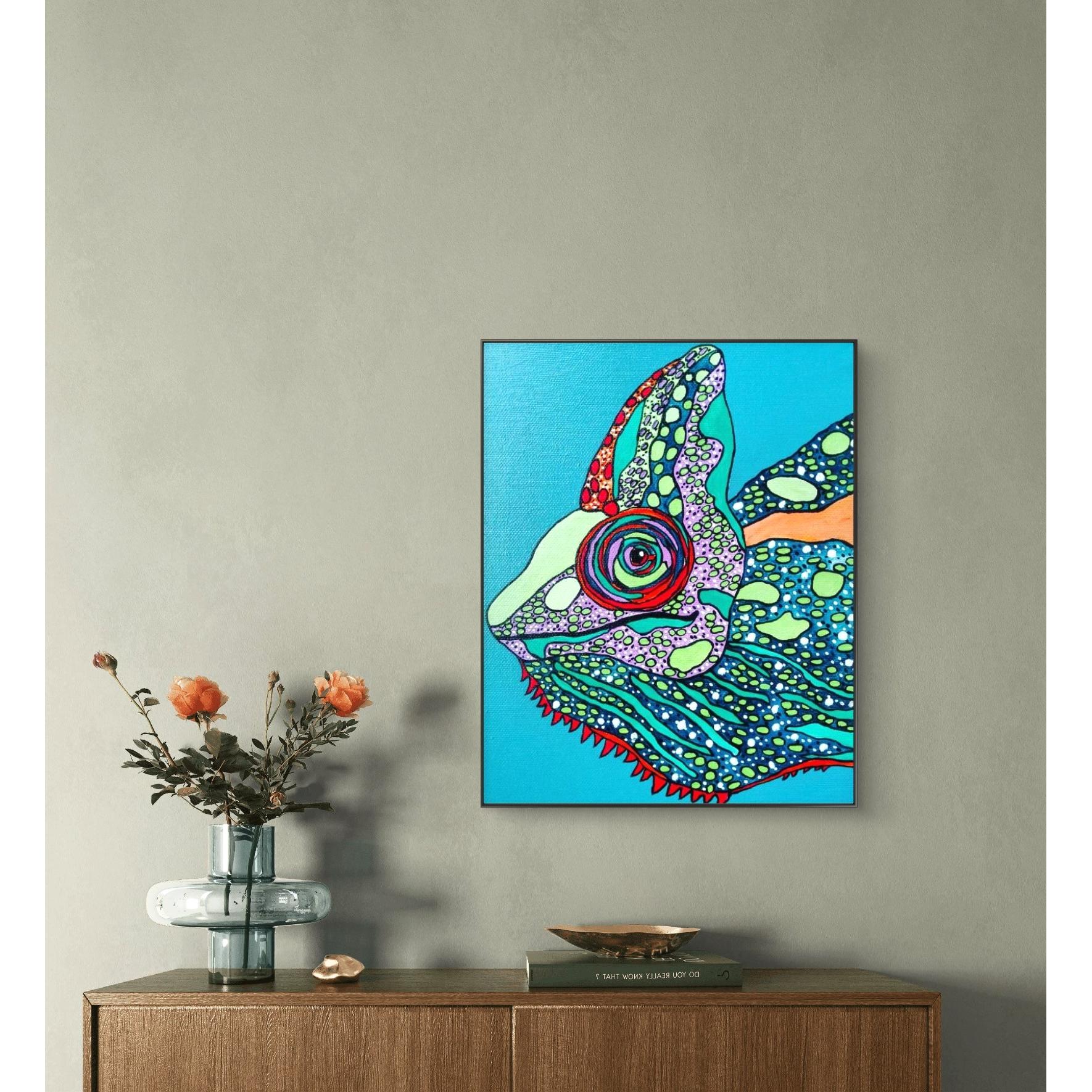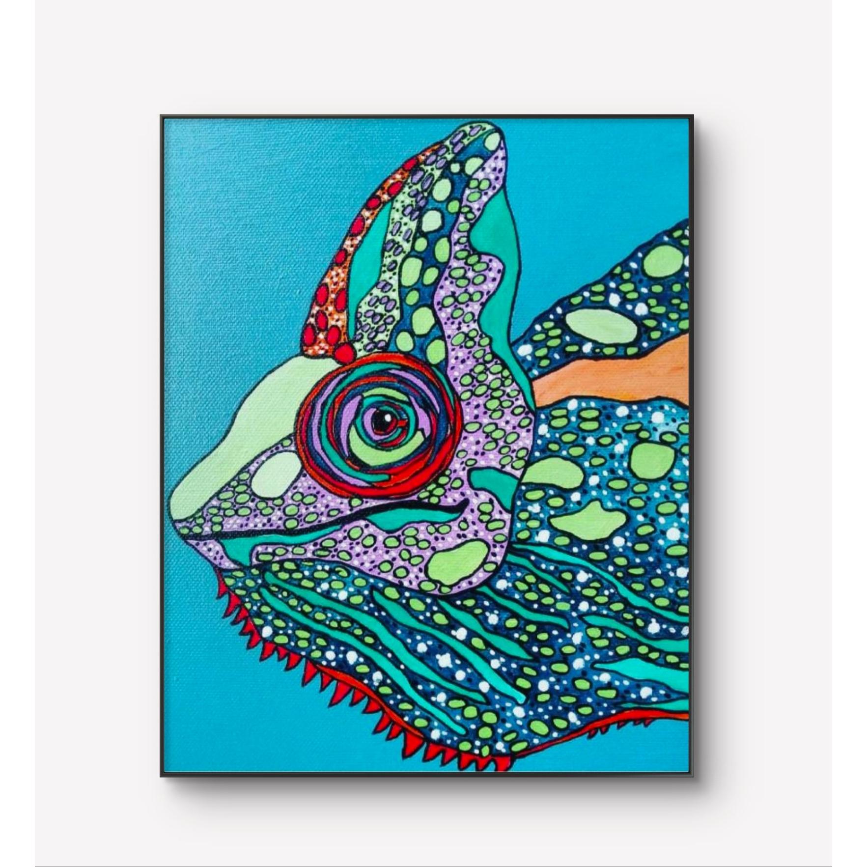 Piccola opera suggestiva per la meticolosità dei particolari di questo ritratto di camaleonte, il colore azzurro di fondo e i colori vivaci dell' animale trsmettono un sentimento di serenità, da qui il titolo " LA GIOIA "