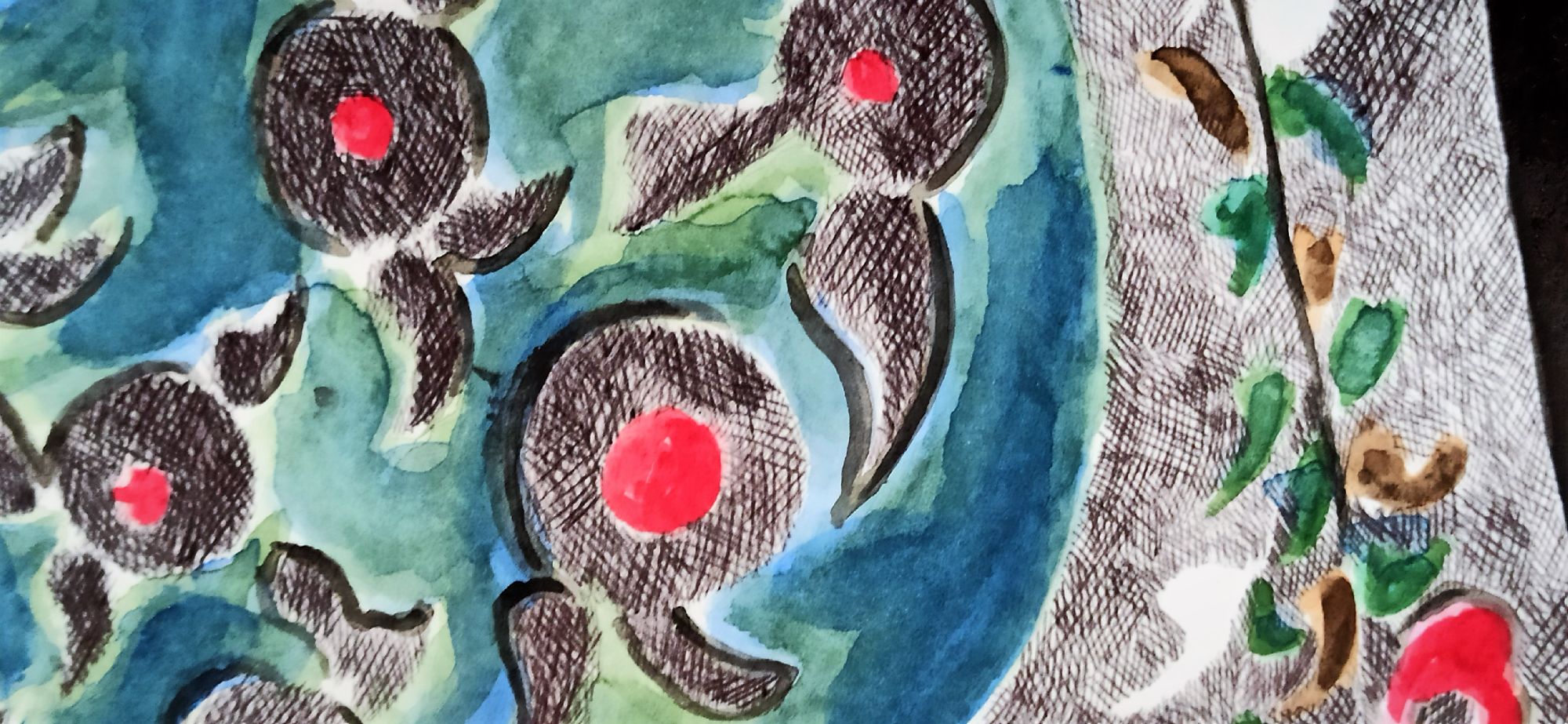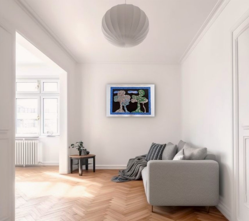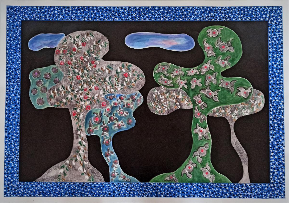 Eseguita su carta di cotone ad acquarello,china e acrilico, rappresenta una natura preservata e incontaminata ,si potrebbe descrivere un paesaggio bucolico anche se frutto della fantasia dell' artista.