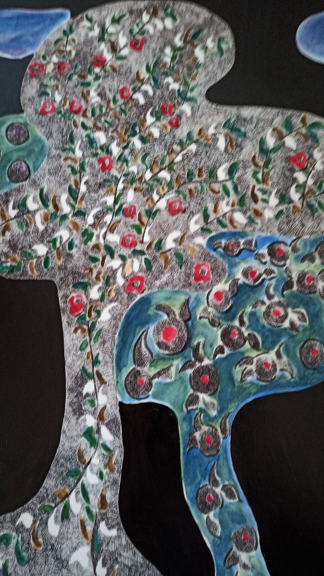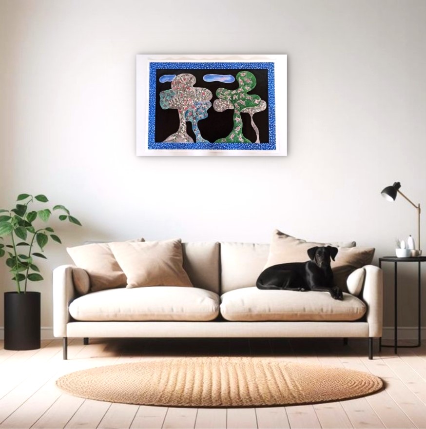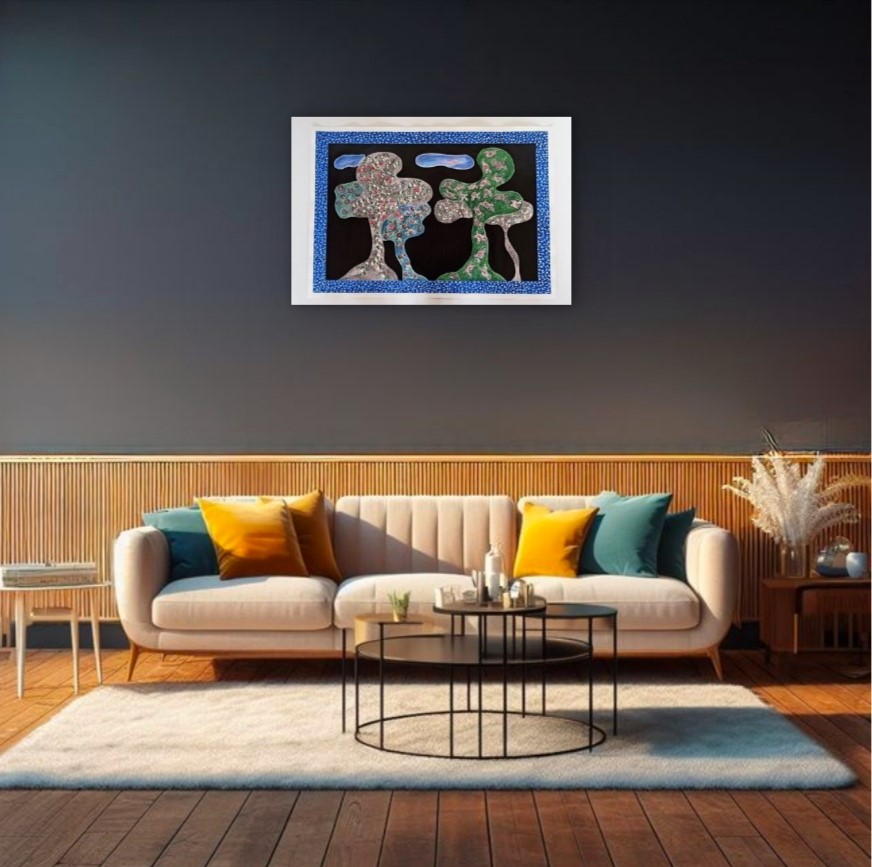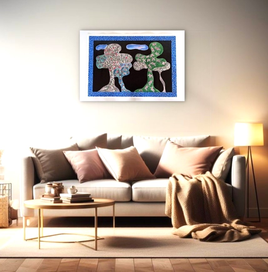 Eseguita su carta di cotone ad acquarello,china e acrilico, rappresenta una natura preservata e incontaminata ,si potrebbe descrivere un paesaggio bucolico anche se frutto della fantasia dell' artista.